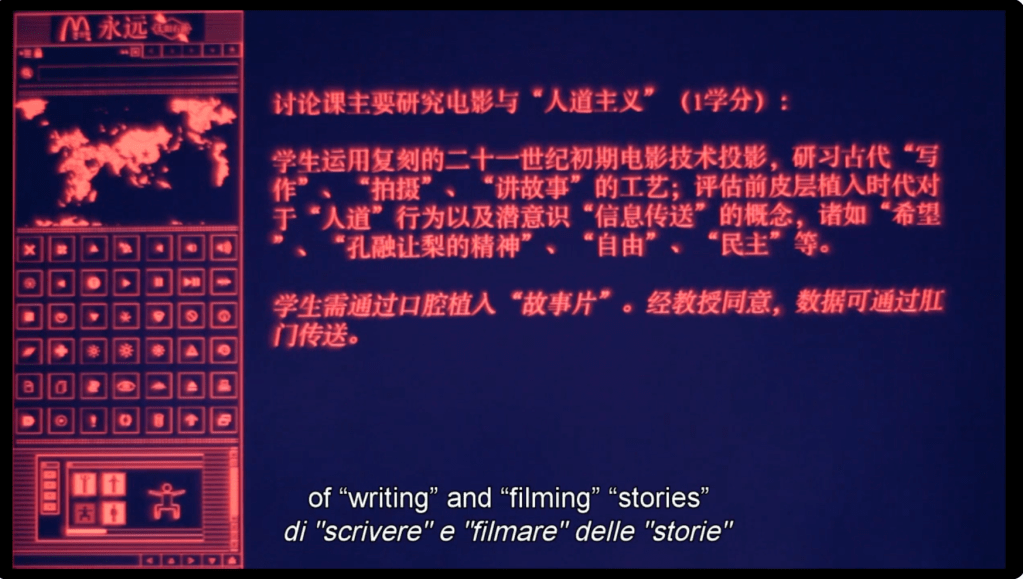 Last but not least, the methods of data transmission are also very interesting: students are required to intra- contex download, make a semen analysis, implant features orally, or anal penetration. Do future film students still need to watch movies with their eyes? Or has cinema evolved into a whole-sensory experience? All the data from a film could be stored on a chip implanted in the brain’s cerebral cortex. All the scenes from the film could then be recognized directly through brain waves. Such a posthumanist film curriculum.